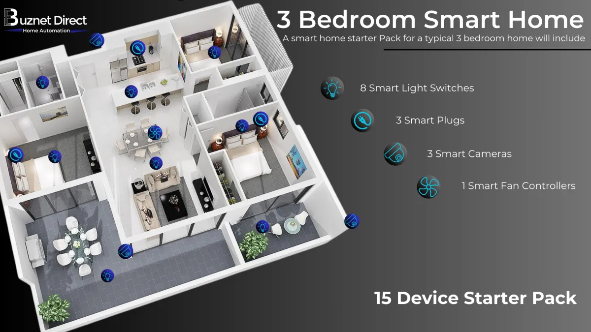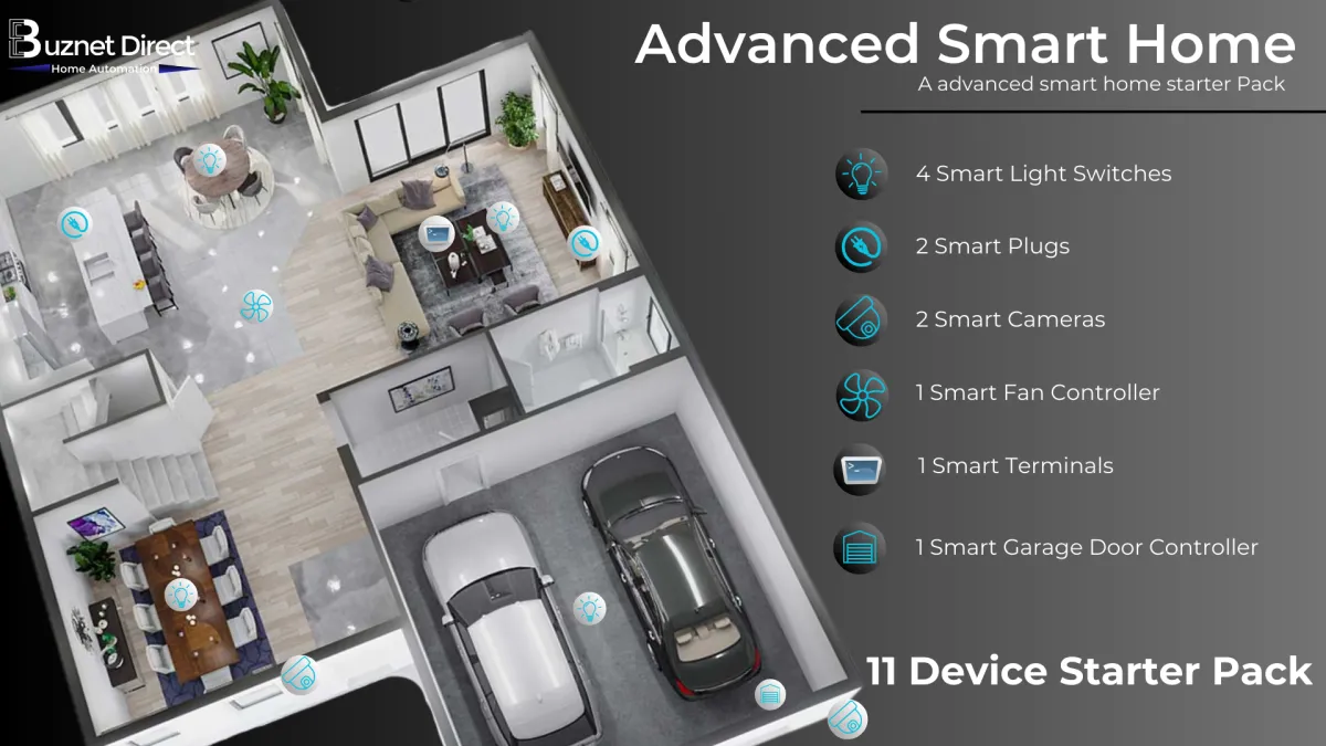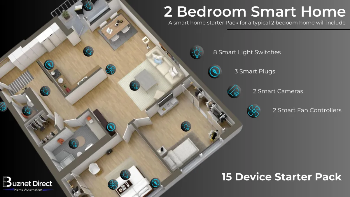 The starter kit includes up to 15 smart devices, which may consist of smart lighting, plugs, ceiling fan controllers, home control panel and cameras, tailored to the layout and needs of your home.